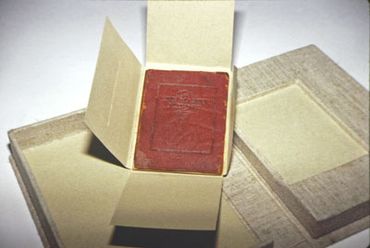 This slip case includes a linen pull tab to release the four flap enclosure which protects the book. The enclosure features a Mylar spine and a text block support to hold the weight of the pages, thereby protecting the sewing.
